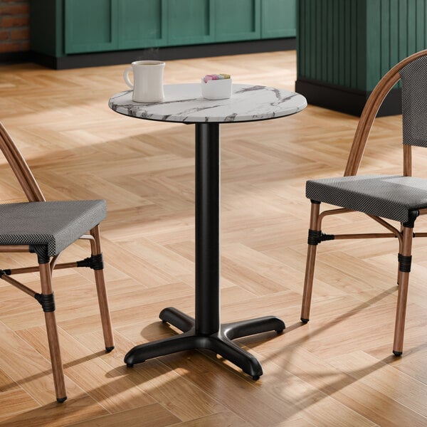 The included cross column table base elevates the table to standard dining height and ensures that the table stays steady and balanced while guests enjoy your signature drinks and dishes. Made of strong stamped steel with a sleek and resilient black e-coating, it's well equipped to weather the elements and resist corrosion. Blending into any environment to enhance your dining space, this table base and column are sure to provide reliable long-lasting use at both indoor and outdoor eateries. Plus, pre-drilled holes allow for the use of floor glides to protect your flooring from scuffs and scratches!