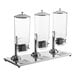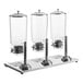 Offer cereal in style with this Choice 8 liter triple canister cereal dispenser! Featuring a sleek stainless steel stand and catch tray, this cereal dispenser elevates your cereal selection off of the countertop, for mess-free service. At the same time, the clear polycarbonate canisters ensure optimum visibility from all angles, effectively merchandising while maintaining a professional presentation.