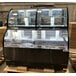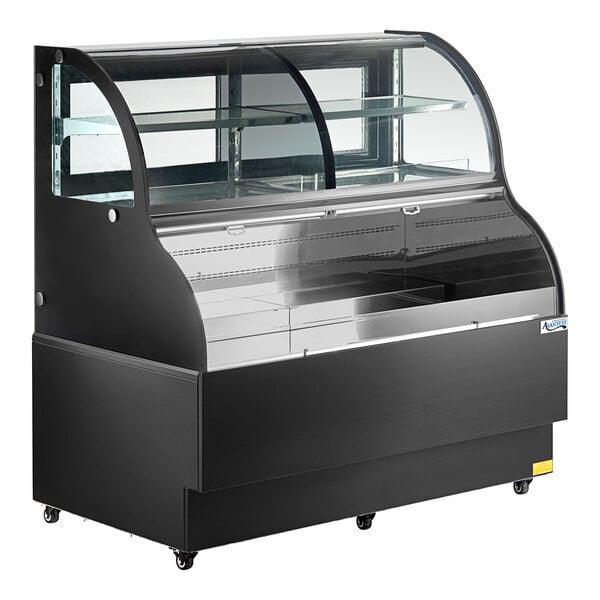 Attractively present your fresh baked goods with this Avantco CAC-60 59 1/8" black curved dual service refrigerated open display merchandiser. This contemporary case keeps contents sanitary while beautifully displaying them on durable glass shelves. Having a dual service open air merchandiser is sure to boost your impulse sales, because customers can clearly see the products you're offering behind the strong glass front, or select products of their choosing from the bottom open air part of the unit. It features bright, cool LED lighting to show off your products on the included adjustable glass shelves. The versatile top section can be adjusted to hold product at room temperature, refrigerated temperature, or can even be independently adjusted to hold product and accommodate both temperatures at the same time.