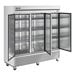 The solid doors are self-closing and come with magnetic door gaskets that provide a tight seal. In addition to stainless steel solid doors, the unit also has anodized aluminum ends and a corrosion-resistant GalFan coated steel back. Plus, the clear coated aluminum-lined interior with a stainless steel floor and covered corners is easy to clean. This unit's cabinet features foamed-in-place polyurethane insulation for added structural strength and to reduce energy loss. This unit comes with (6) 4" stem casters, three with brakes, for maneuverability during cleaning.