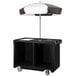 The Cambro Camcruiser CVC55110 black customizable vending cart is ideal for adding revenue opportunities and increasing sales away from the kitchen or cafeteria! Its brightly colored umbrella creates high visibility, and its large storage cabinets minimize restocking.