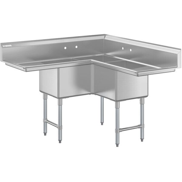 Outfit your facility with a long-lasting sink with this Regency 57" 3-compartment stainless steel corner sink with two drainboards. Featuring 3 compartments, the sink is perfect for dishwashing applications, with one 18" x 18" x 12" sink for each of the 3 stages of the washing process. Plus, the corner design helps maximize your back-of-house space and create an efficient layout. One left 18" and one right 18" drainboard are built into the unit for added convenience.