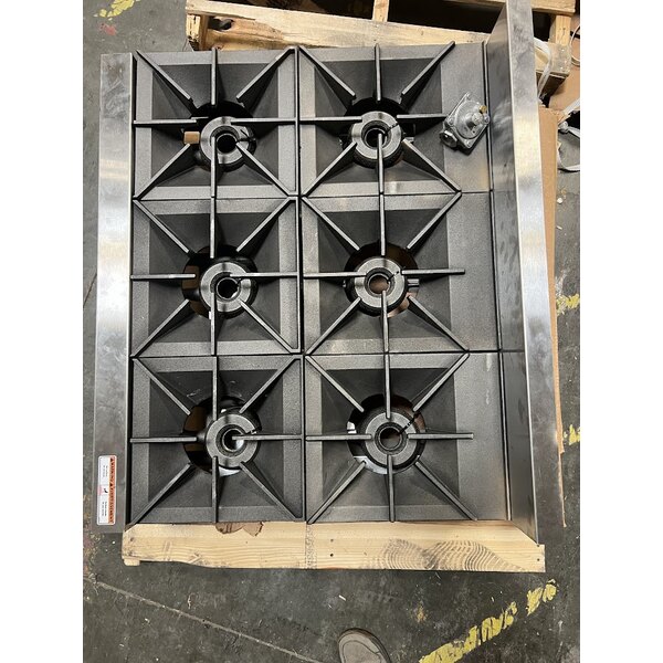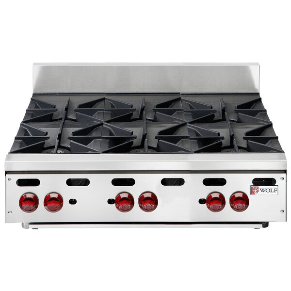 If you need a way to cook delicious sides, entrees, sauces, and other irresistable menu items but don't have the floor space needed for a full-sized range, then look no further than the Wolf by Vulcan AHP636-NAT Achiever 6 burner countertop range! Designed for installation on top of a countertop, chef base, or equipment stand, this unit features heavy-duty cast iron top grates that combine with 6 open burners and 180,000 BTU of heating power for quick heating and reliable performance in your busy commercial kitchen. The standing pilot lights ensure that there is always a flame ready to ignite the burners, and the individual infinite controls let you use one burner at a time or set each burner as needed depending on the foods you are cooking.