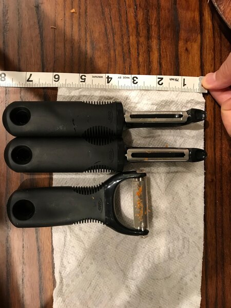 These peelers are super sharp so make sure to keep those plastic guards on when not in use. They are comfortable to hold, even when hands are wet. Blades show no sign of rust, maintain a sharp edge. Machine washable is a plus, although some stuck bits might survive the dishwasher cycle. Tips: For the Julien blade, first flatten out the surface of the vegetable. Pierce it with a fork to gain leverage. Apply at least double the pressure you apply with the other two tools. -1 star for flimsy safety covers and relatively difficult use of the julienne peeler.