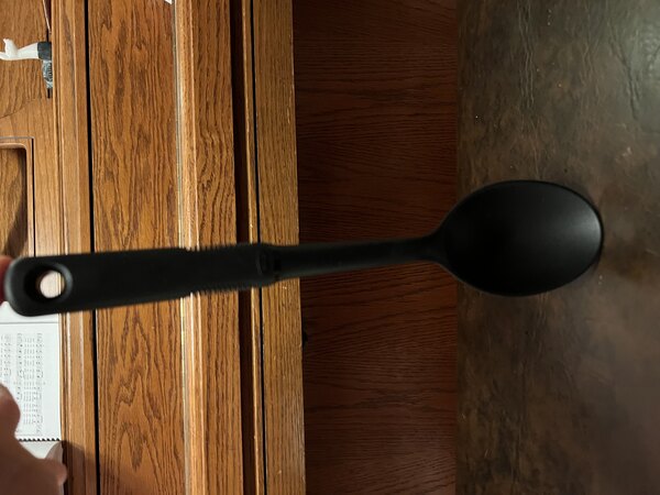 Whether using to stir your thick sauces and soups or for your buffet displays, this OXO Good Grips 13 1/2" high heat nylon solid spoon is sure to be a useful addition to your commercial kitchen. Made with heavy-duty, high heat nylon, this spoon can withstand temperatures up to 400 degrees Fahrenheit for safety around hot cookware and appliances. Plus, the nylon material won't scratch or mar your pans like metal spoons, making it ideal for non-stick cookware.