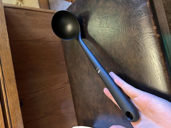A plastic and rubber ladle the plastic on the bottom half sounds and feels like a ping pong style plastic but in a good and reinforced way. It has the silicone handle to reduce how hot the handle is and I feel it’s a great fit for my kitchen restock.
