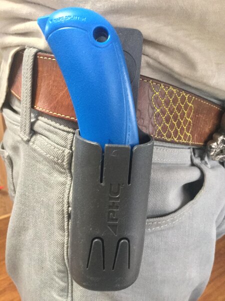 A very trustworthy and handy holder with side clip. It holds a number of my various box cutters and has an easy to use side clip for pockets or belts.