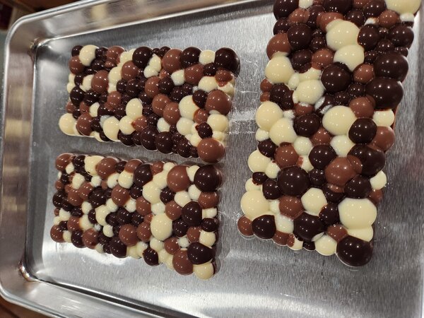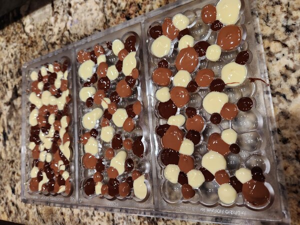 Such a cool chocolate mold! This particular sparkling bubble mold is tedious if you're trying to fill with multiple colors and chocolate. Definitely recommend a squeeze bottle to make the process easier. If you're simply filling it with one single chocolate, ladling it in and smoothing it out is a quick simple process