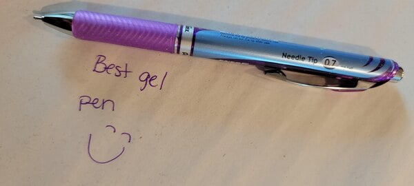 The Pentel EnerGel is my perfect pen! I always have extras on hand. I like to grade my students papers in the colored ink. Smooth clicking and a comfortable barrel and grip. Great ink that doesn't smudge.