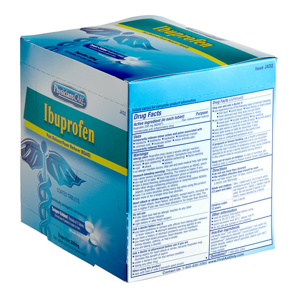 Alleviate the pain and discomfort of many minor aches and pains with PhysiciansCare ibuprofen tablets. These coated tablets are easy to swallow and contain 200 mg ibuprofen per tablet, providing fast-acting, temporary relief from many minor aches and pains. Each packet is sealed in tamper-evident packaging. They're great for stocking medical cabinets and first aid kits in restaurants, schools, and hotels.