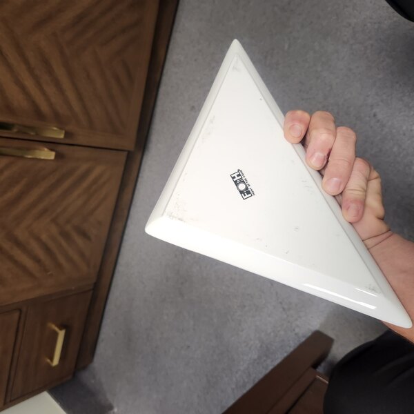Create dynamic dining presentations with this Front of the House DAP013WHP23 Mod 12" x 6" bright white triangle porcelain plate. Perfectly proportioned to house a variety of culinary delights, this versatile plate is great for doling out gourmet servings of small entrees or shareable appetizers. It can even be used to create a layered display with smaller or larger Mod triangle plates. No matter your signature cuisine, this product is sure to make your menu items pop, offering a beautiful bright white coloring that will cause your delicious masterpieces to stand out from all the rest! Plus, its elegant rim angles upward to nicely frame your plated meals. This combination of modern features makes it ideal for casual restaurants, cafes, or other foodservice establishments that wish to promote heightened creativity through unique serving applications.