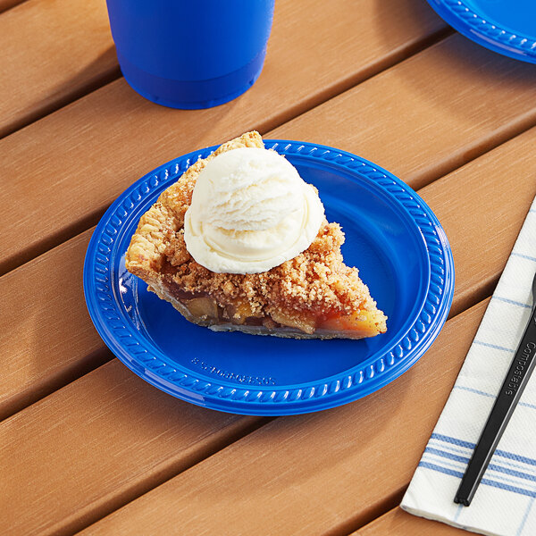 Thanks to its vibrant, blue color, this plate creates the perfect backdrop for colorful foods, ensuring a striking appearance. Its embossed rim also adds a touch of elegance to your service, while its classic, round shape lends a traditional look to your table settings.