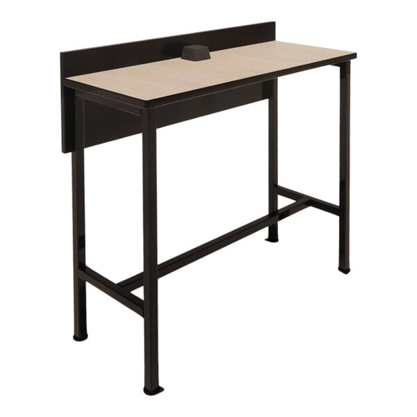 Provide your guests with a reliable workspace with this Plymold 48" x 19" beigewood laminate bar height powered dining counter. This unit creates more counter space in your coffee shop, quick service restaurant, or airport while maintaining a thin profile with its compact design and privacy with its 16" black laminate privacy panel. Additionally, its power receptacle offers easy charging of multiple devices at a time, making it the perfect place to work from when needed. It comes ready with 2 outlets and 2 USB ports to provide an easy charging solution for a variety of devices. Plus, the base of this unit has a stretcher bar for additional support.