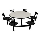 Upgrade your establishment with this Plymold Jupiter 60" beige round table top with 6 black seats. This unit is ideal for lunchrooms, cafeterias, and breakrooms. The beige table top with black seats is a stylish option for most settings, and the round island frame means that no wall attachments are necessary. Featuring a 60" round high pressure commercial laminate table top with vinyl t-mold edges, this unit is sure to withstand the demands of your establishment. The table top is 1 1/8" thick with a 45 lb. density particleboard core, and the underside has a phenolic backer to safeguard against moisture. The 3" radius corners have a rounded design that helps ease the sharpness of the edges.