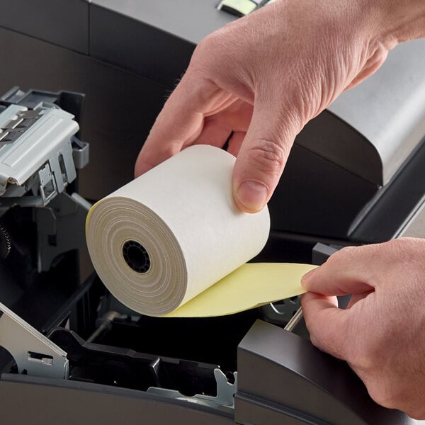 Print crisp, clear receipts quickly with this PointPlus 2 3/4" x 90' carbonless 2-ply cash register POS paper roll. Made from carbonless paper, this roll features a convenient two-ply design that prints both a canary yellow and white copy of your receipt. This is great for printing customer receipts and easy-to-read sales records, and helps you keep accurate accounting records for your establishment.