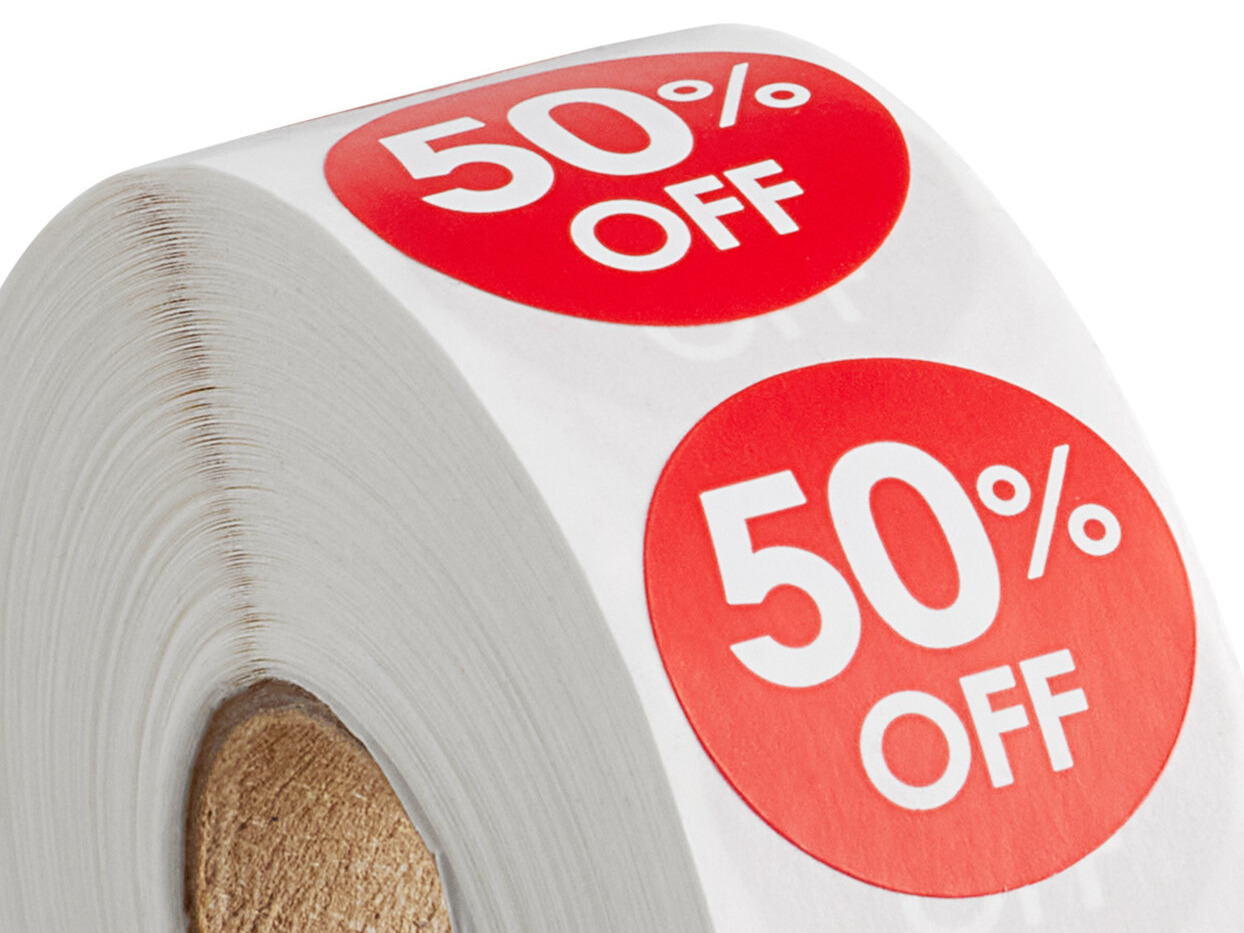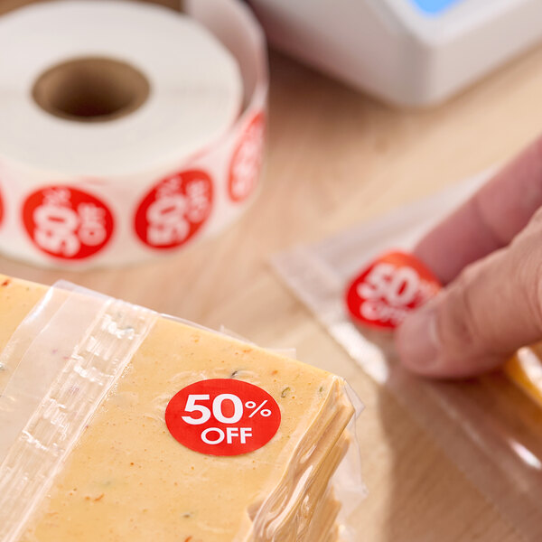 This label's bold red color draws attention to its message, sure to catch the eyes of your customers or staff. It features a "50% Off" message, alerting your customers to items that are on sale. Its durable, permanent adhesive sticks securely to most surfaces and allows for long-term use with back-of-house supplies. This label's preprinted design saves your business time by eliminating the need to create a custom label from scratch every time. Use it to readily indicate discounted items at your grocery store, deli, convenience store, or healthcare facility.
