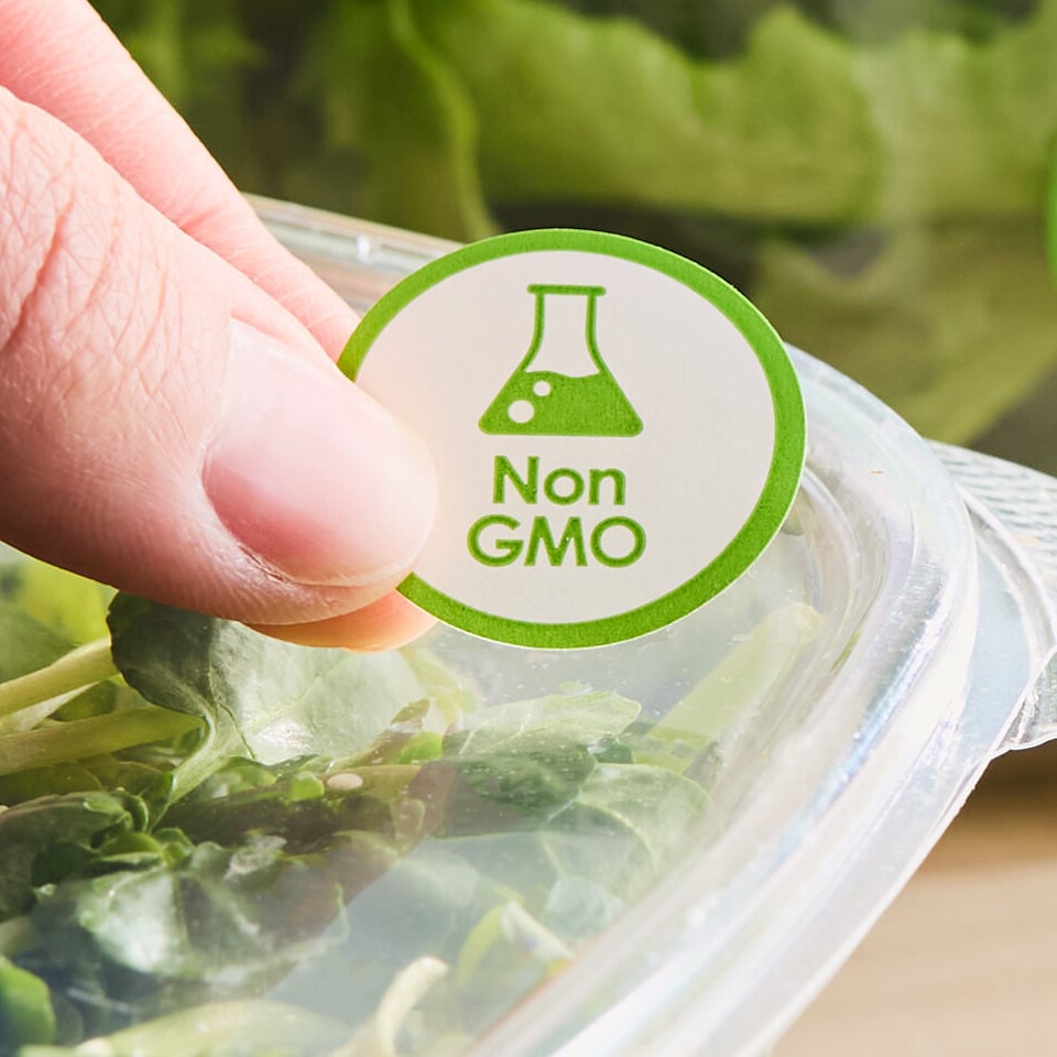 This label's eye-catching design draws attention to your unique food or beverage offerings, allowing you to market to customers with specific dietary requirements. It features a "NON GMO" message and matching graphic, perfect for clearly identifying foods that are produced without genetic engineering and with ingredients that are not derived from genetically modified organisms (GMOs).