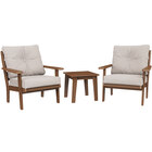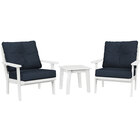 The POLYWOOD Lakeside White / Marine Indigo deep seating patio set with Lakeside table and chairs is a sophisticated yet casual addition to any outdoor entertaining space. This cottage-living inspired set comes with one end table and two deep seating chairs from the Lakeside collection for a consistent aesthetic, providing guests with a comfortable spot to relax and enjoy cocktails, small plates, or even desserts. The pieces in this set are made from renowned POLYWOOD lumber slats that provide the look of painted wood, but without any of the upkeep that is required of real wood. For incredible durability and equally low maintenance, this HDPE lumber won't splinter, crack, chip, peel, or rot and you never have to worry about painting, staining, or waterproofing it.