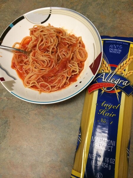 After trying all the recipes I could find on the internet, I decided to experiment on my own. I took half packet of the angel hair pasta and broke it into 3-inch pieces, diced some spring onions, tomato, green pepper and chicken franks. Then I put everything in a pot, added turkey stock, enough water to cover it, sprinkled in pepper, salt and oregano and left to cook for 8 to 10 minutes. I later served it with dried parsley leaves and grated Parmesan cheese sprinkled over it.. Delicious is an understatement of how it tasted.