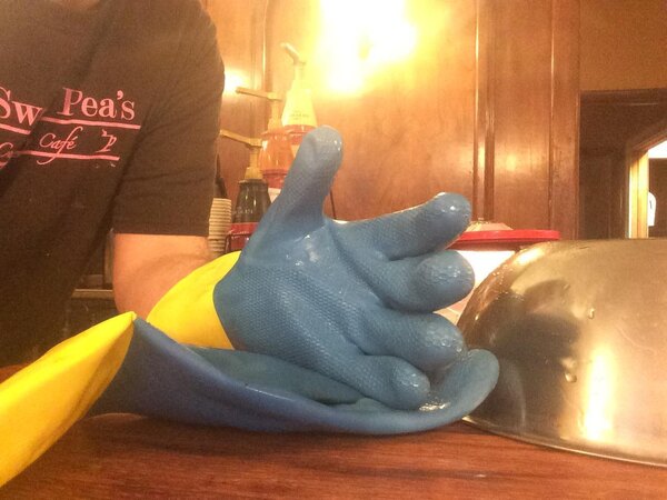 These gloves keep our tender fingers from the chap monster. Also, they protect from all those chemicals we soak our dishes in, thus reducing our intake of chemicals into our bodies. Good times.