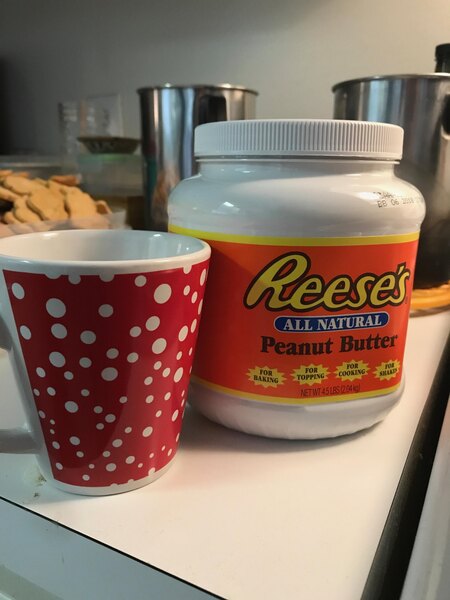 Reese’s all natural peanut butter. A jug that weighs 4.5 pounds! It has to be mixed well and it then can be used in many different dishes.