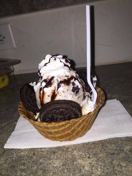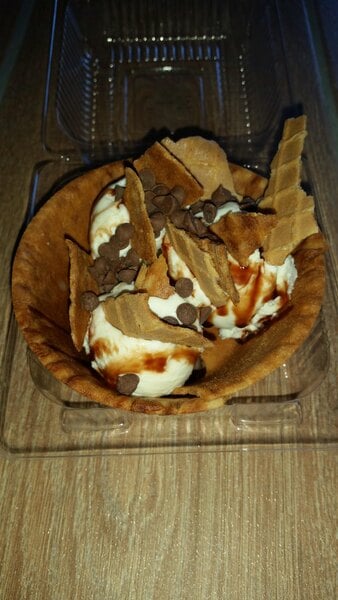 The Joy ice cream waffle bowl is great and makes a great sundae. The waffle bowl is so fresh and low that you can eat the whole thing.