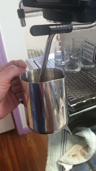 Stainless steel frothing picture. We use this to prepare milk for our 10 ounce lattes, cappuccinos and hot chocolate. Very easy to clean up when done.