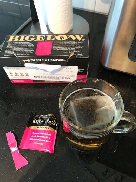 The Bigelow raspberry royale tea steeps much quicker than some other teas available. It provides a pleasant aroma infused with the raspberry, but the raspberry flavor itself is less present.