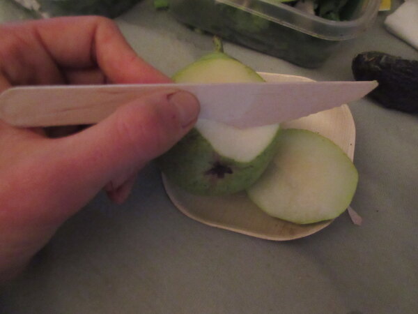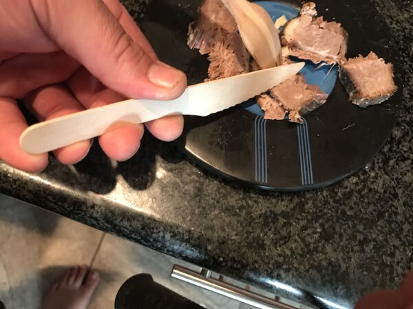 This is a really cool eco-friendly disposable wooden heavyweight knife really good for catering jobs or parties at your house you don't have to worry about cleaning up silverware and it's eco-friendly