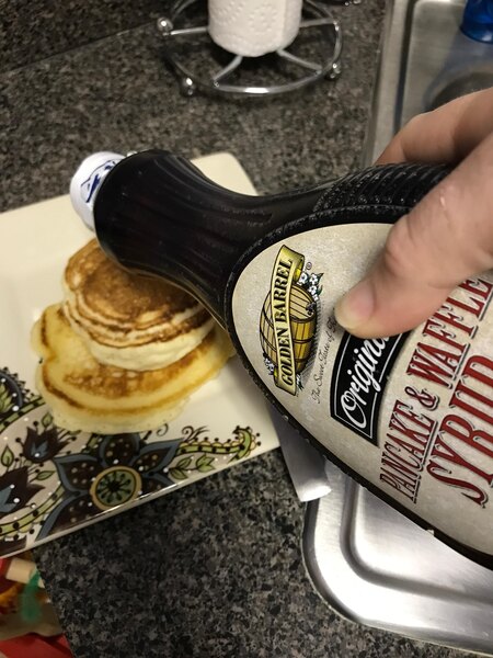 Golden Barrel Pancake and Waffle Syrup 24 oz. Bottle hey now inexpensive pancake syrup, how come you taste better than the leading brands but cost half as much? No big deal here, just be prepared to be sold out!!
