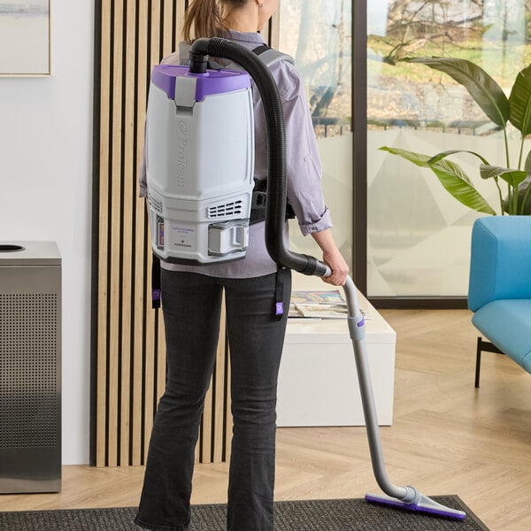 This vacuum is ergonomically designed with a 4-step FlexFit articulating harness, which is inspired by hiking backpacks and rests comfortably on the user's hips for hours of wear. Plus, the harness's purple numbered touchpoints provide a customized, quick-adjust fit with no tools required. With its ProLevel filtration system with HEPA media, this vacuum helps reduce allergens and asthma triggers found in indoor environments. It captures 99.9% of dust mites, pollen, bacteria, and other particulates that are 0.3 to 0.5 microns in size.