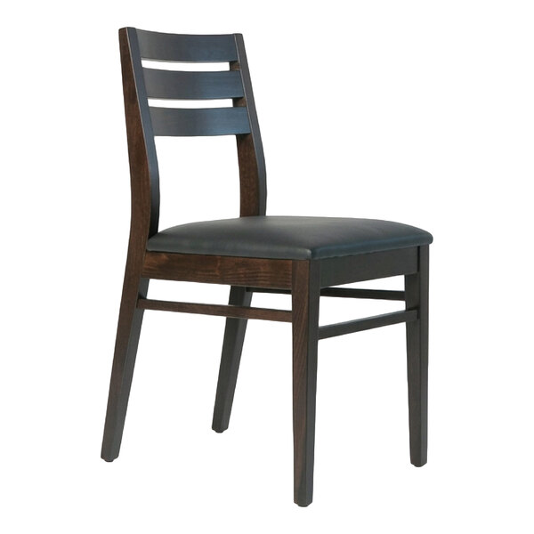Combine reliable performance and aesthetic appeal in your commercial space with this QA Group dark brown beech wood ladder back dining chair with black faux leather seat! This chair features a clean and professional appearance that adds a touch of sophistication to any restaurant, bar, or hospitality setting. The fully upholstered seat is designed for ultimate comfort, boasting high-density foam and padding to ensure your guests can relax and enjoy their experience. Crafted with a durable beech wood frame and commercial-grade faux leather, this chair is built to withstand the demands of a busy commercial environment, providing long-lasting performance and timeless elegance.