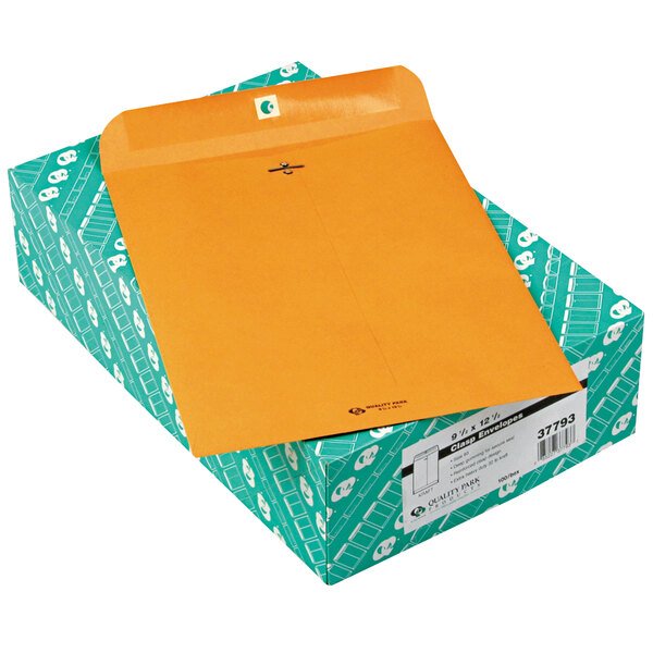 Seal and send your important business documents in this Quality Park 37793 #93 9 1/2" x 12 1/2" brown kraft clasp / gummed seal file envelope. Featuring a 32 lb. basis weight and center seam construction, this envelope is a sturdy and convenient way to mail items. A clasp closure keeps the envelope's contents well contained without being permanently resealed for reuse, but it can also be permanently sealed by applying moisture to the gummed flap for transit. Its windowless design also provides lots of space for writing, labeling, or printing on its front.