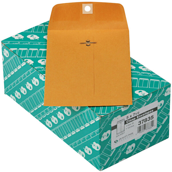 Seal and send your important business documents in this Quality Park 37835 #35 5" x 7 1/2" brown kraft clasp / gummed seal file envelope. Featuring a 28 lb. basis weight and center seam construction, this envelope is a sturdy and convenient way to mail items. A clasp closure keeps the envelope's contents well contained without being permanently resealed for reuse, but it can also be permanently sealed by applying moisture to the gummed flap for transit. Its windowless design also provides lots of space for writing, labeling, or printing on its front.