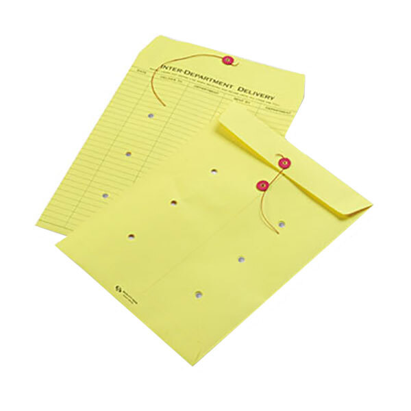 Seal and send your important business documents in this Quality Park 63576 #97 10" x 13" yellow paper interoffice envelope with string and button closure. Featuring a 28 lb. basis weight and a center seam construction, this envelope is sturdy and perfect for holding a variety of important documents. Its string and button closure also makes it easy to quickly close and secure items. The front also includes lined areas for labeling, adding to its organizational value.