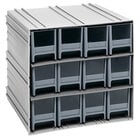 The Quantum 11 3/8" x 11 3/4" x 11" interlocking storage cabinets with 12 blue medium drawers with windows makes keeping organized easier than ever! This storage cabinet boasts 12 blue medium drawers that come with two dividers per drawer, making any type of storage possible! The high-impact polystyrene construction of the cabinet is durable, allowing it to withstand daily wear and tear. Providing ultimate convenience, it is capable of interlocking both horizontally and vertically to best fit your storage needs and also maximize space. Pre-drilled holes on the rear even allow for wall-mounting, saving floor space if needed. It is an ideal solution for organizing tools, bolts and fasteners, molds, parts, and paper documents in one organized space.
