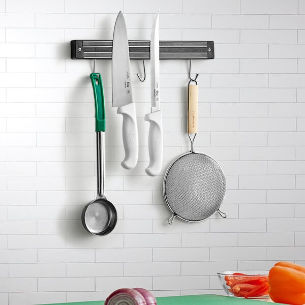 In addition to storing knives, this product also includes removable hooks that allow you to hang other tools. It's great for holding spoons, spatulas, whisks, strainers, and all manner of utensils! Install this knife holder / strip with hooks close to your prep or cooking areas to keep frequently used tools within easy reach for your staff.