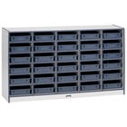 Keep your classroom, daycare center, or early learning facility organized with this Rainbow Accents 0931JCWW003 60" x 15" x 35 1/2" mobile 30-slot blue TRUEdge freckled-gray laminate communication center with blue paper trays. Featuring 30 slots with matching blue paper trays, this item is perfect for keeping graded assignments, art projects, take-home folders, and even computer tablets neatly contained so your students always know where to find their personal materials. Use the letter-sized trays to hold and organize papers inside each slot without fear of wrinkling their edges, or stack the trays on the side and use the communication center on its own for visible storage!