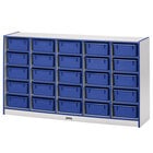 Keep your classroom, daycare center, or early learning facility organized with this Rainbow Accents 4026JCWW005 60" x 15" x 35 1/2" mobile 25-cubbie teal TRUEdge freckled-gray laminate storage cabinet with teal tubs. Featuring 25 spacious cubbies with matching teal tubs, this item is perfect for keeping books, small toys, and art materials neatly contained so your floors remain free of dangerous tripping hazards. Use the dishpan-sized tubs to hold and organize items inside each cubbie without fear of damaging or curling their edges, or stack the tubs on the side and use the cabinet on its own for visible storage!