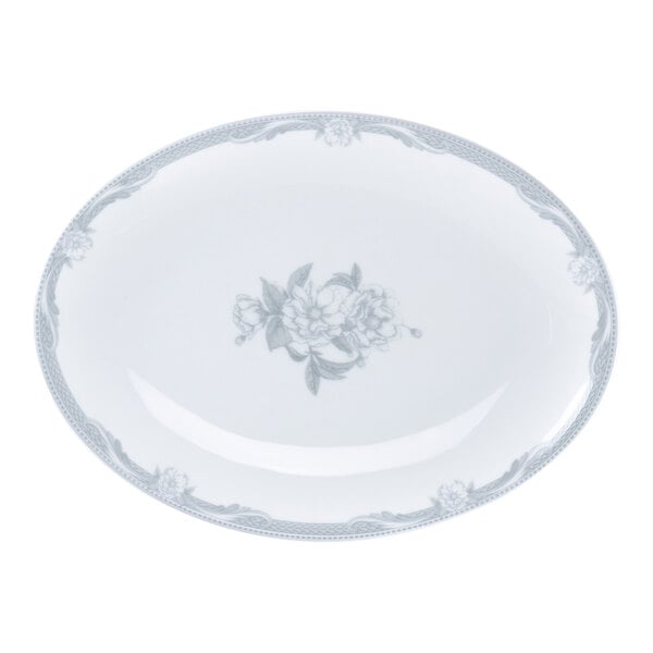 Enhance the presentation of your best offerings with this RAK Porcelain Floret 10 1/4" x 7 1/2" light gray oval coupe porcelain platter. Crafted from premium-quality porcelain, this platter offers superior durability and strength. Ideal for upscale restaurants and catered events, this platter features an elegant design with a coupe rim and glossy finish. It's perfect for serving lunch entrees, salads, and specialty seafood dishes.