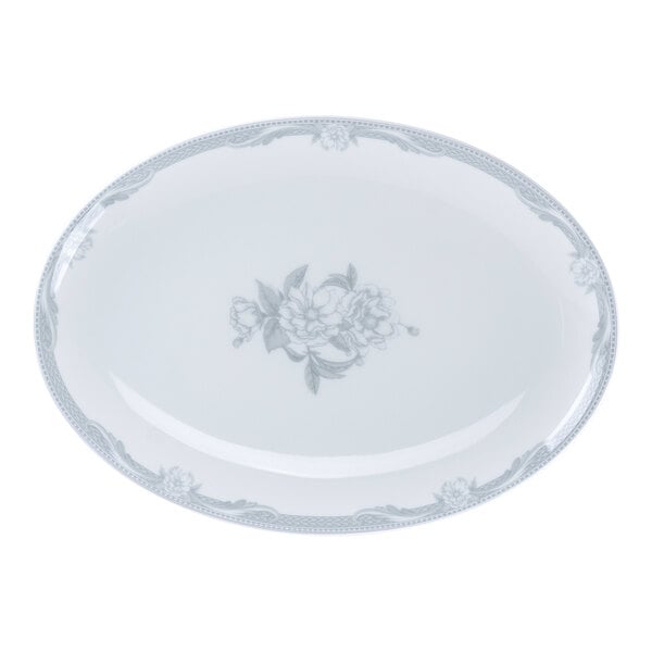 Enhance the presentation of your best offerings with this RAK Porcelain Floret 12 5/8" x 9" light gray oval coupe porcelain platter. Crafted from premium-quality porcelain, this platter offers superior durability and strength. Ideal for upscale restaurants and catered events, this platter features an elegant design with a coupe rim and glossy finish. It's perfect for serving large meat and seafood entrees.
