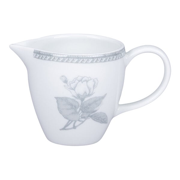 Enhance the presentation of your best offerings with this RAK Porcelain Floret 8.44 oz. light gray porcelain creamer. Crafted from premium-quality porcelain, this creamer offers superior durability and strength. Ideal for upscale restaurants and catered events, this creamer features an elegant design with a glossy finish. The handle makes it easy to pour while the lip ensures efficient pouring without spills when in use. It's perfect for serving cream or milk.