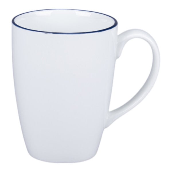 Enhance the presentation of your best offerings with this RAK Porcelain Rimz 12.13 oz. white porcelain flora mug. Crafted from premium-quality porcelain, this mug offers superior durability and strength. Ideal for upscale restaurants and catered events, this mug features a modern design with a blue rim, glossy finish, and handle. It's perfect for serving coffees, cappuccinos, lattes, and hot chocolates.