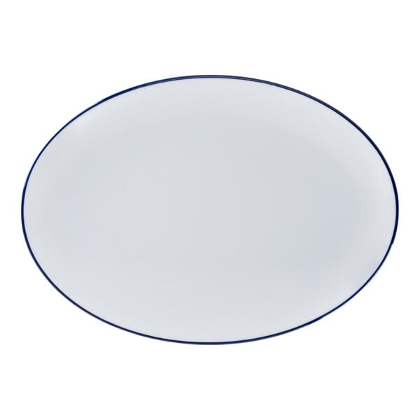 RAK Porcelain Rimz 12 5/8" x 9" White Oval Coupe Porcelain Platter with Blue Rim - 6/Case