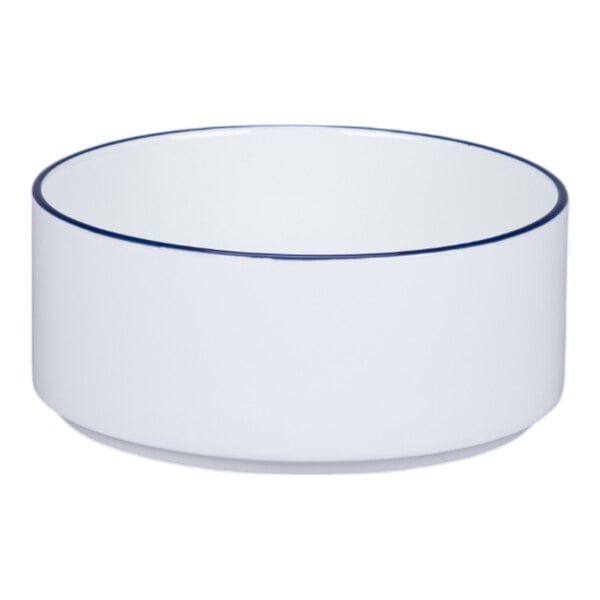 RAK Porcelain Rimz 21 oz. White Round Stackable Porcelain Bowl with Blue Rim - 12/Case