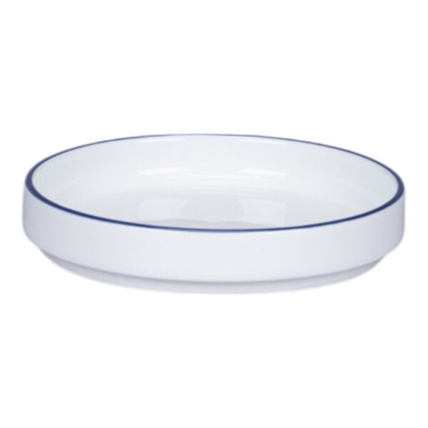 RAK Porcelain Rimz 4 5/16" White Round Stackable Flat Porcelain Plate / Lid with Blue Rim - 12/Case