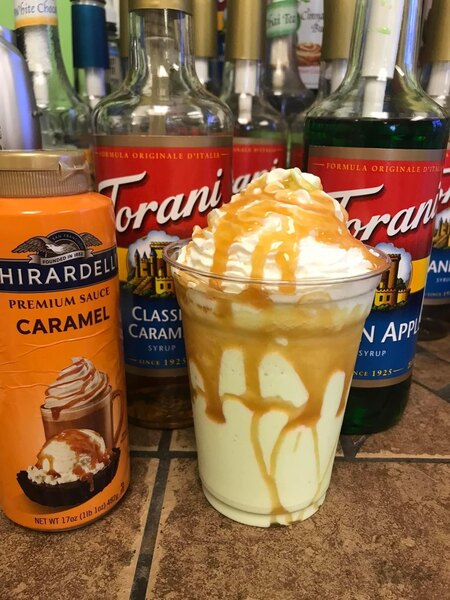 We make an apple Frappuccino and a caramel apple Frappuccino this apple purée is the perfect drizzle for inside the cup and on top of the whip topping. We also put it on our deep dish apple pie ice cream
