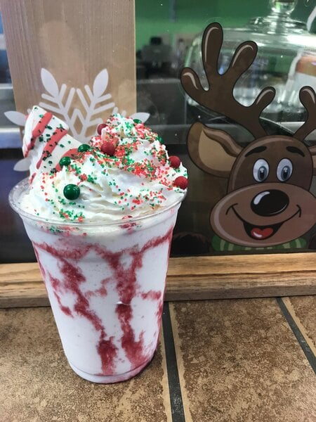 This is so good We put it on the Christmas tree Frappuccino, white chocolate and raspberry cold brew coffees and the chocolate raspberry milkshake with whip cream and raspberry drizzle is amazing