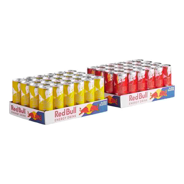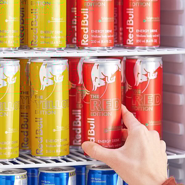This product features the Red Bull branding your customers know and love in watermelon and fruity tropical flavors that are sure to be a hit! This beverage has been carefully crafted with high-quality ingredients, making it rich in vitamin B6, vitamin B12, and pantothenic acid. With amino acids and a kick of caffeine, this product is sure to keep your patrons energized and boost your sales! With refreshing watermelon and fruity tropical flavors, Red Bull not only quenches thirst but also gives individuals an energizing lift.