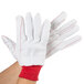 Protect your hands with these red polyester / cotton double palm work gloves. They're great for opening boxes that may have hidden staples or other sharp edges. The double palm design provides extra protection for your palms but leaves the rest single layered so that the gloves are breathable for maximum comfort, even in hot environments. A convenient knit wrist styling provides added warmth while preventing particles from entering the glove. Perfect for warehouses, construction sites, and handy-man jobs alike, these gloves are sure to boost both safety and productivity. These gloves comply with food handling requirements, making them ideal for use in kitchens or food trucks.